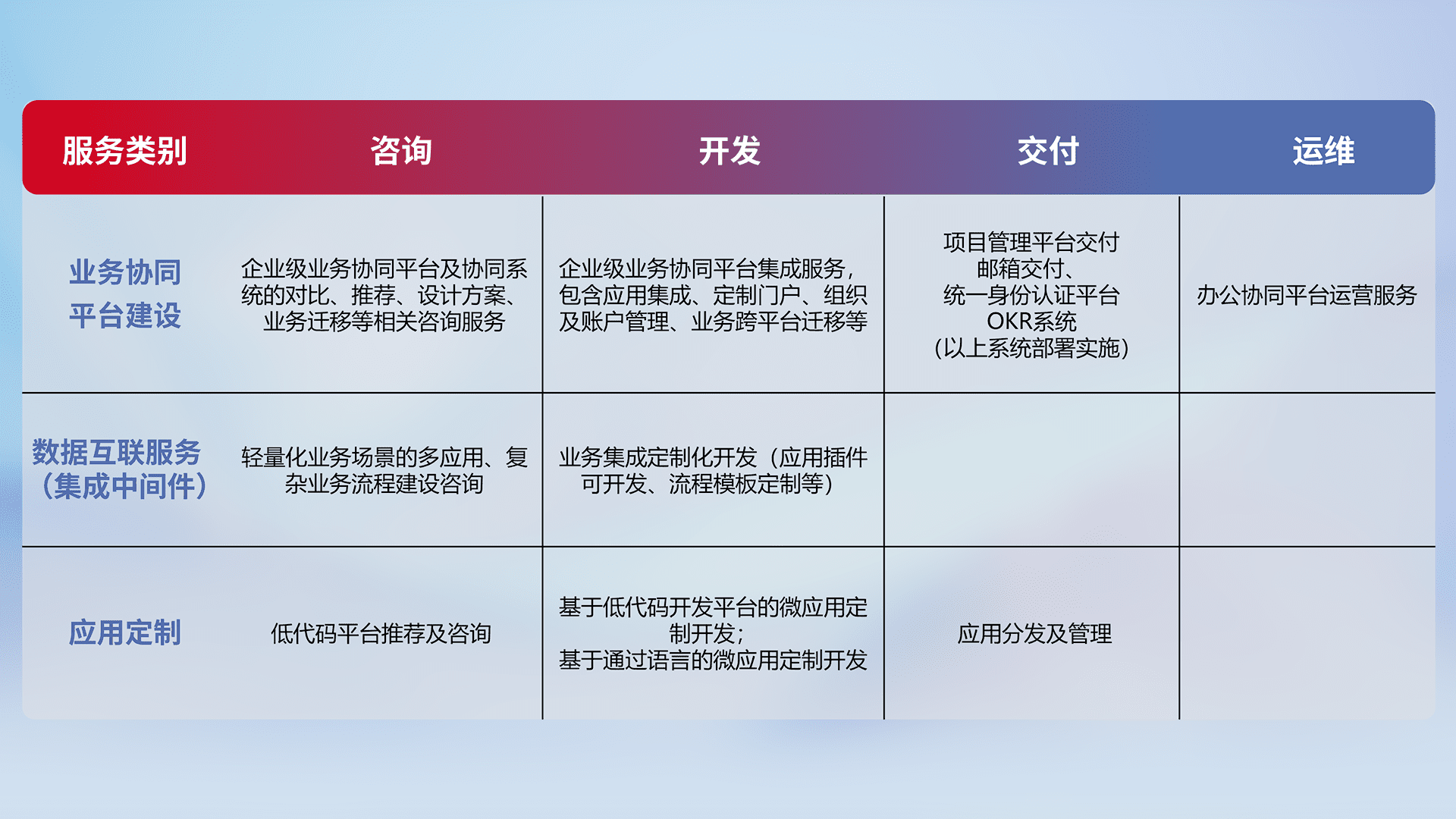 针对钉钉、、、、企微、、、、IDaas等平台级产品提供产品的规划、、、、方案、、、交付、、定制化开发等服务,,实现如统一协同办公、、、智能客户服务、、、混合会议管理、、、、智能数据查询、、、等业务场景,,,,实现数字化转型。。。